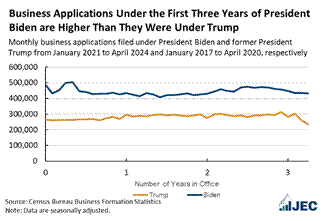 “Since the start of the Biden-Harris Administration, there have been more than 20 million new business applications with an average of 441,453 filed each month – a rate over 91% faster than pre-pandemic averages. This historic Small Business Boom has been driven by women and people of color, with data showing Black business ownership doubling since 2019, Latino business ownership at the highest level on record, and the number of women-owned businesses is increasing at nearly twice the rate of male-owned businesses.”(SBA November 2024) The number of small business applications during the Biden presidency far exceeded the number of applications during Trump’s first term. Now, in his second term, small business applications are down and the ones arriving are tilted towards manufacturing.